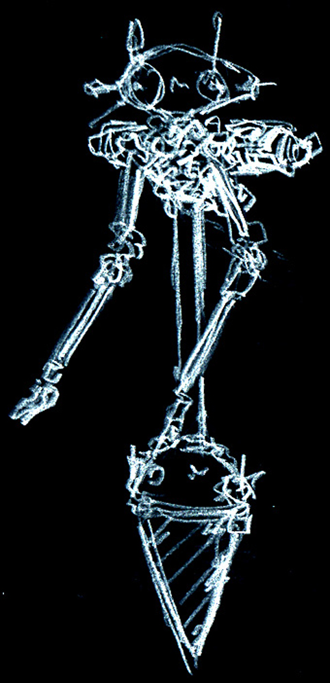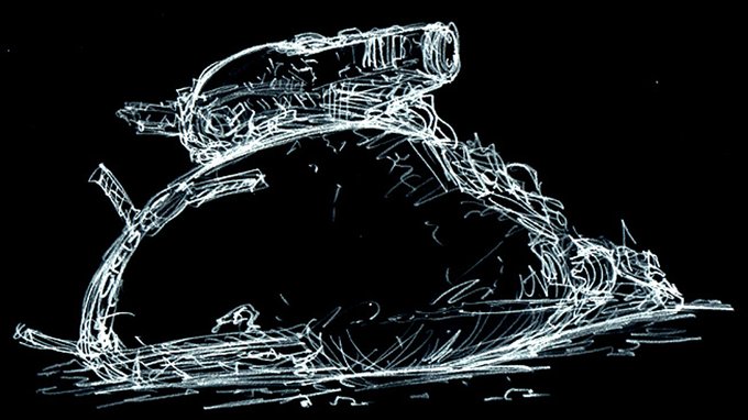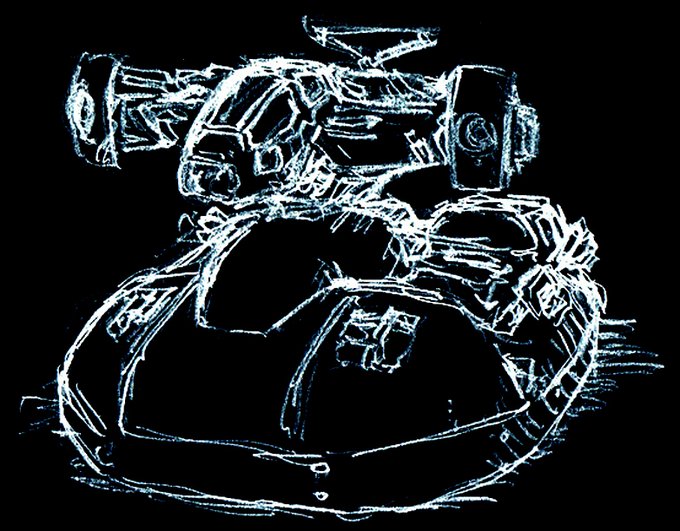 シュトラール軍・無人偵察機『ドリルポッター』 アイディアスケッチ再掲。 #マシーネンクリーガー #作っていいのよ ノイスポッターは常に浮遊している必要があり、非移動時もエネルギーを消費する問題があった。 当機は機体下部のドリルで地表に機体を固定することで非移動時のエネルギー消費をゼロ
