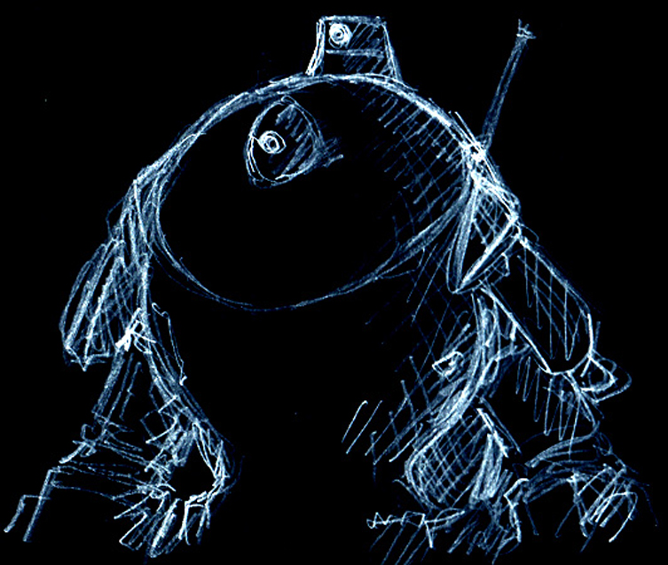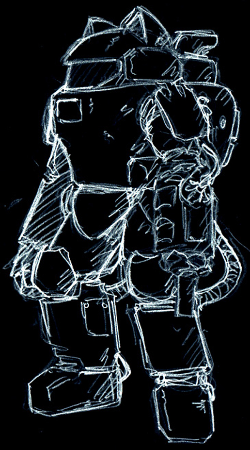 傭兵軍・装甲戦闘宇宙服『フリーズボール』 アイディアスケッチ再掲。 停戦後にシュトラール軍から供与を受けたブレードアンテナを装備したファイアボール。 対プルート戦に投入されたかも知れない。 #マシーネンクリーガー #作っていいのよ