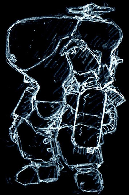 シュトラール軍・無人歩行偵察機『ボックスレーテ』 アイディアスケッチ再掲。 機体前面が箱形になっている。 何が入っているかは不明。 #マシーネンクリーガー #作っていいのよ 面白い形を描いてみただけで何が入っているかは考えていないのだ。