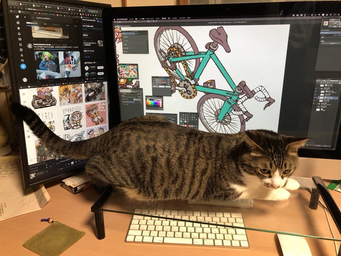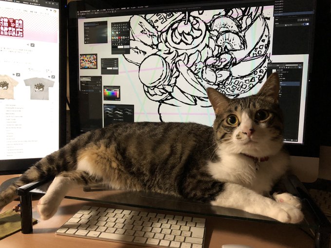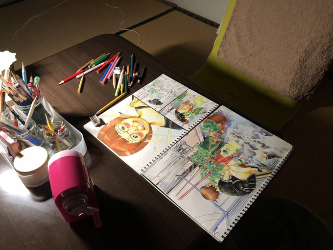 台風の中同人誌の原稿をメインのデスクトップで作業しているからいつ停電になってパソコン止まるかひやひやしながら作業しているわあ…。ひええ。 #漫画好きと繋がりたい #猫耳 #作業風景 #絵描きさんと繋がりたい #液タブ