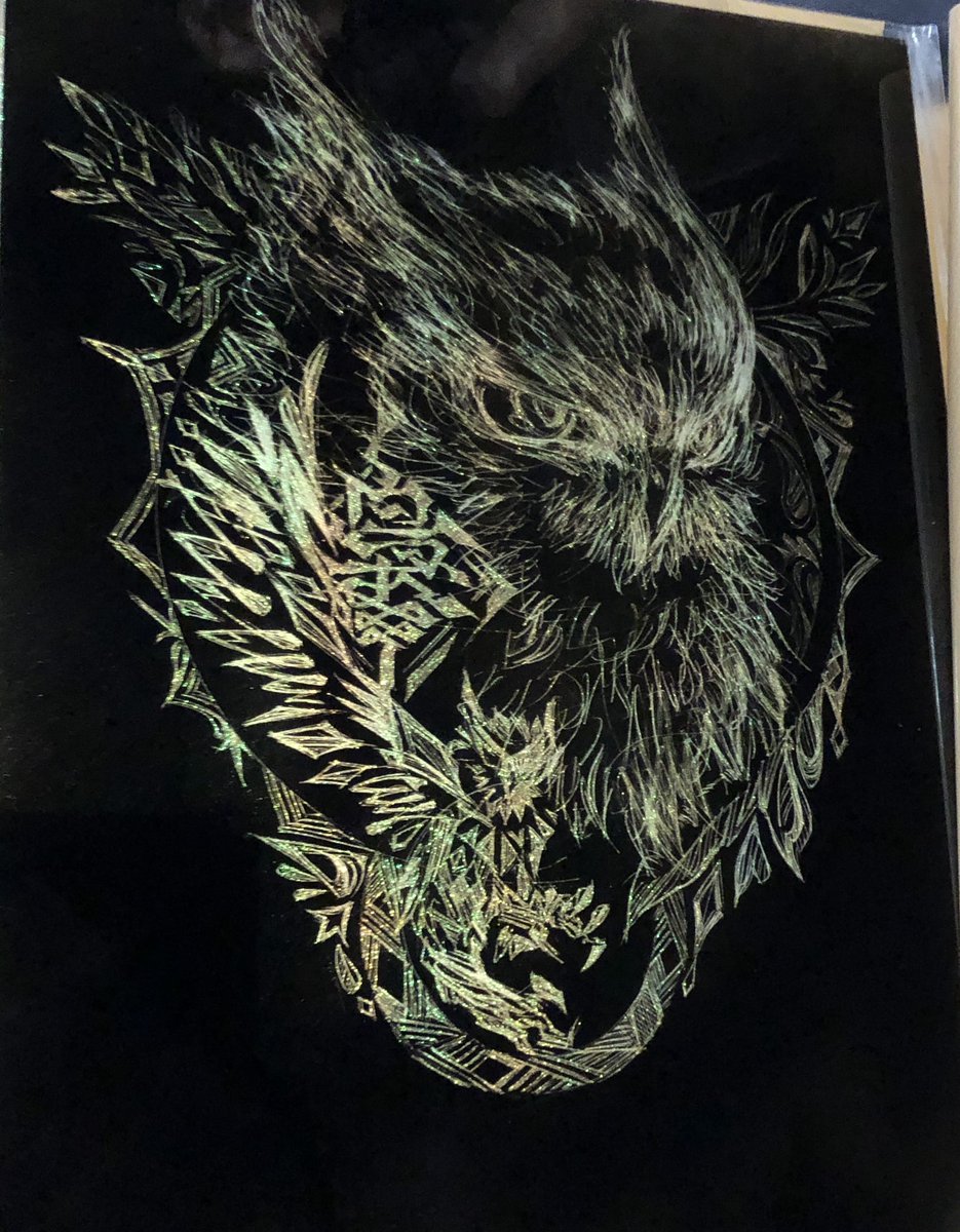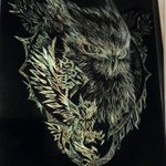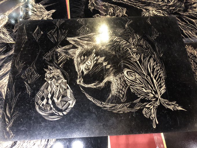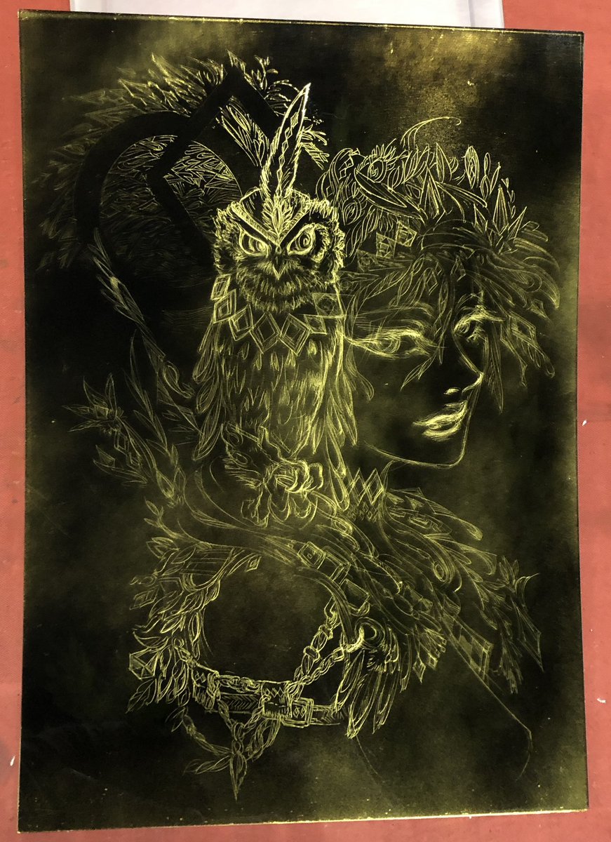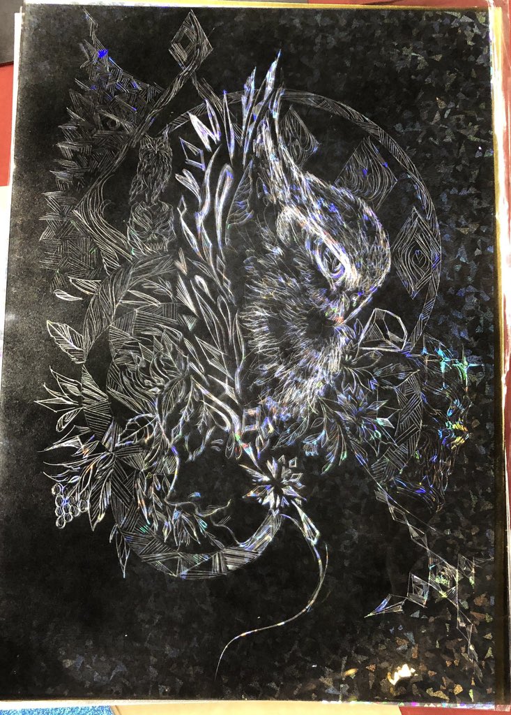 #鳥達のTwitter展覧会 アクリル板をカッターナイフで削って描く #スクラッチアート 下描きなしの一発描き 原画そのままの状態 ツリーに #作画タイムラプス とフクロウモチーフまとめ🦉 #絵描きさんと繋がりたい #PortfolioDay #ArtistOnTwitter