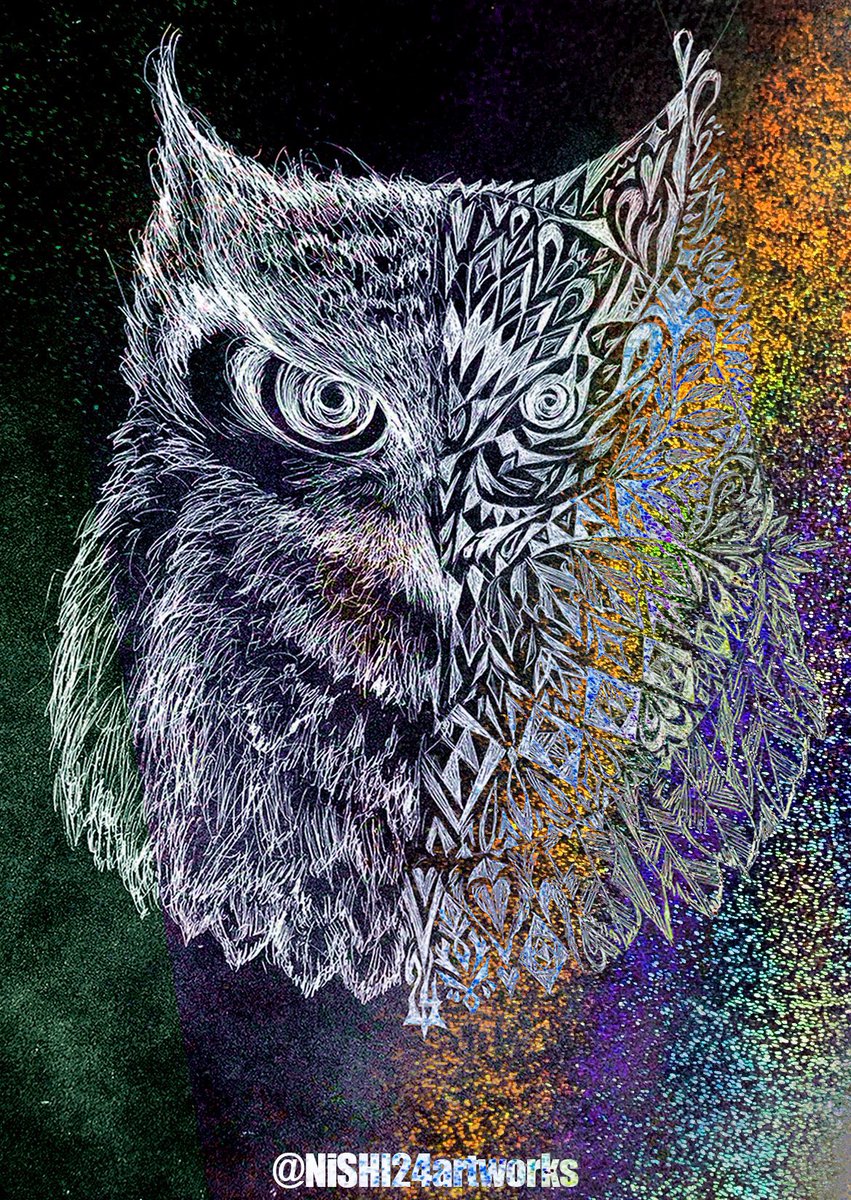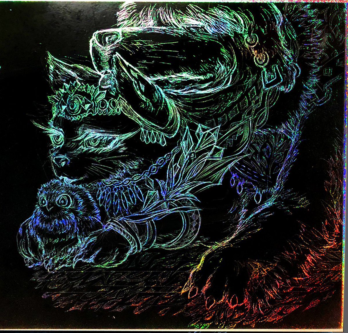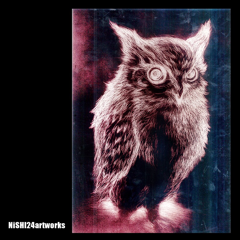 #鳥達のTwitter展覧会 アクリル板をカッターナイフで削って描く #スクラッチアート 下描きなしの一発描き ツリーに #作画タイムラプス とフクロウモチーフまとめ🦉 #絵描きさんと繋がりたい