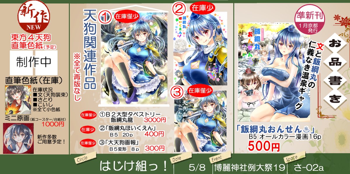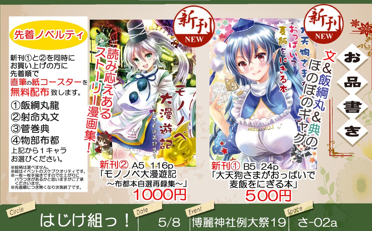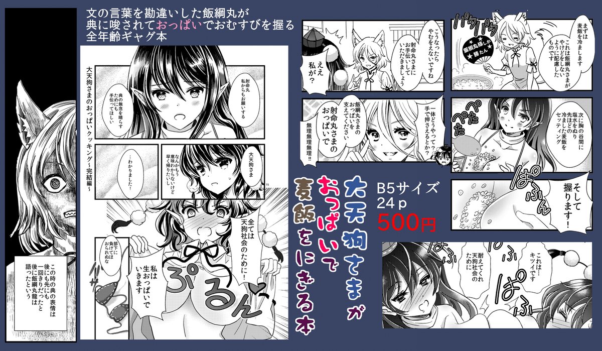 #例大祭19告知 「はじけ組っ!」さ02a新刊①「大天狗さまがおっぱいで麦飯をにぎる本」B5 24p 500円 新ビジネスで麦飯店を経営する飯綱丸さんが取材に来た文の言葉を勘違い&典に唆されておっぱいで麦飯を握る事になる全年齢ギャグ本です。宜しくお願い致します 委託 melonbooks.co.jp/detail/detail.…