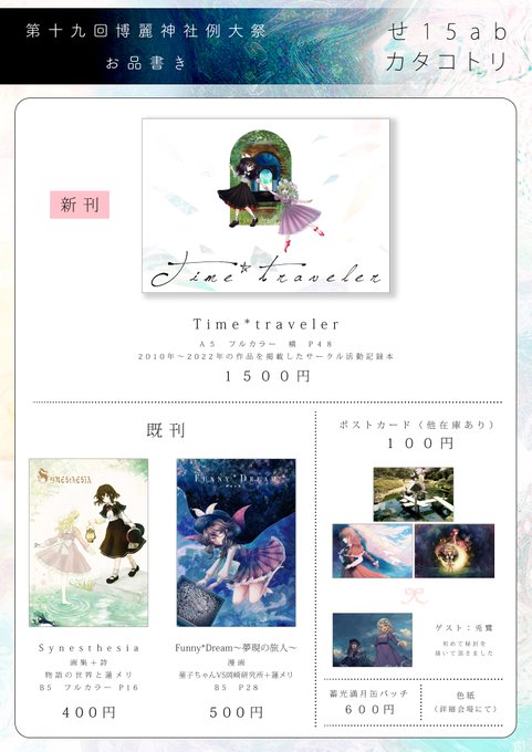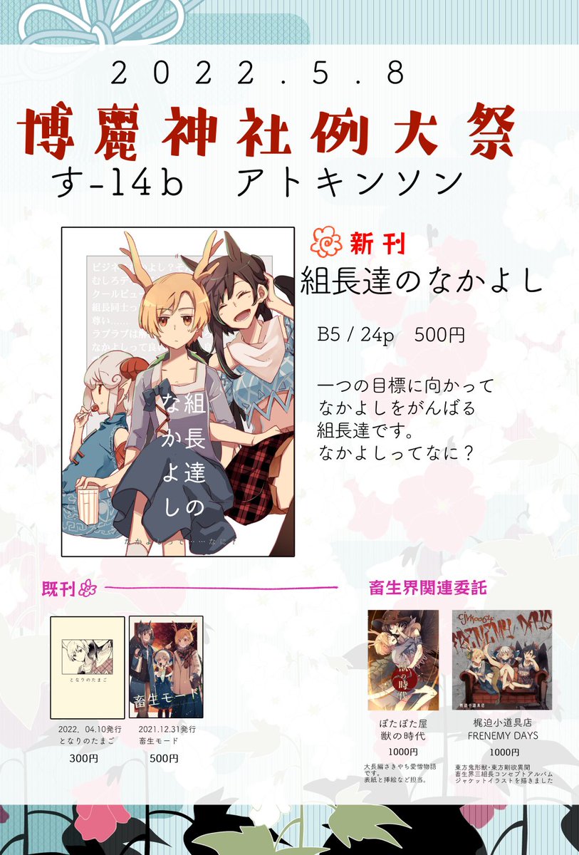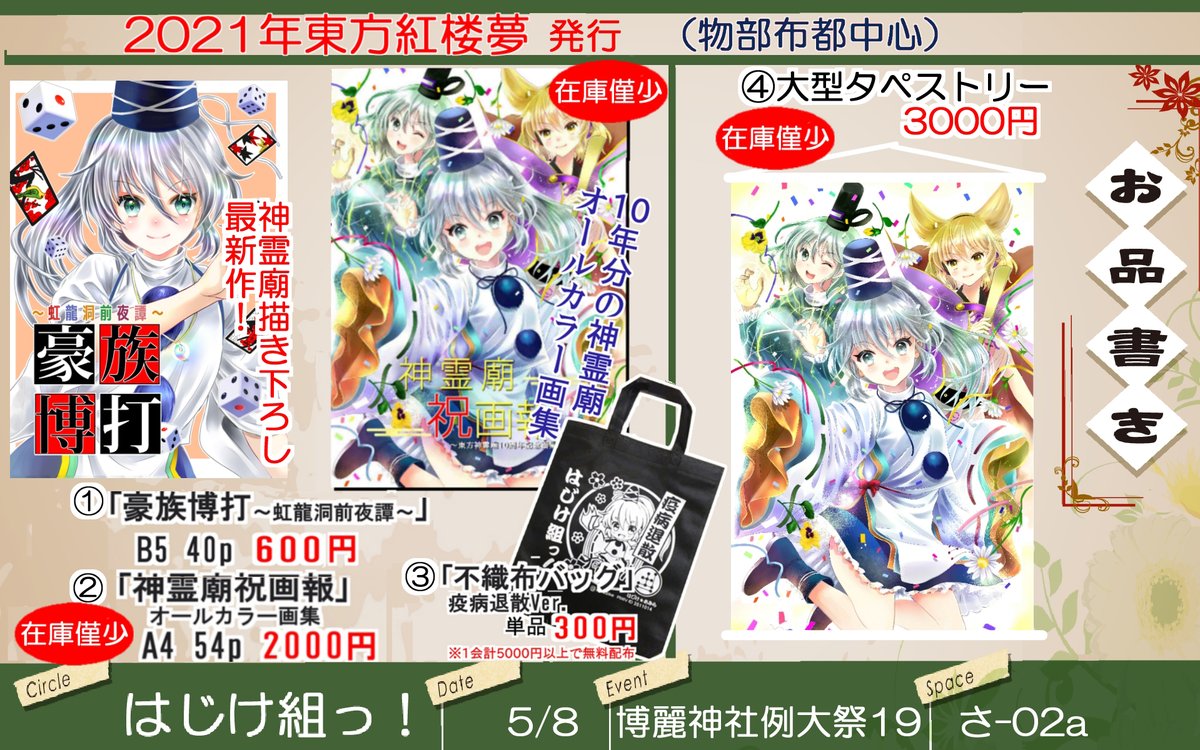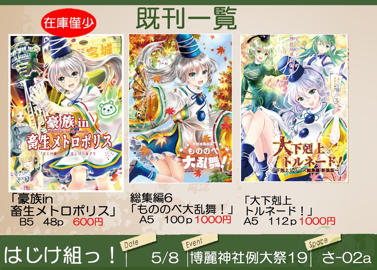 #例大祭19告知 「はじけ組っ!」さ02a新刊②「モノノベ大漫遊記」A5 116p 1000円 自選再録集/布都ギャグ中編ストーリー3本+α収録 「夏の埋火」「布都の鬼隠し」「はたらく仙人」を収録。笑いあり涙ありの読み応えある作品を読みたい方に。あらすじはリプ欄参照 委託 melonbooks.co.jp/detail/detail.…