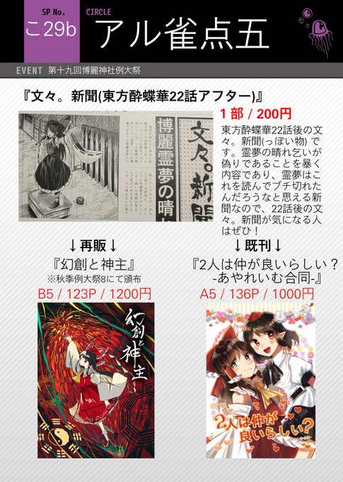 【新刊告知】 人間と妖怪と神様と。 幻想少女たちの1年を綴った記録寫眞集です。 ”幻想回顧録” 世界観を楽しんで頂きたい一冊となっております。 スペース:せ8b #博麗神社例大祭 #例大祭19告知 #顔の見えないコス写真