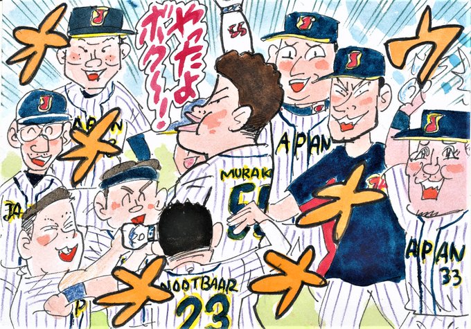 【鼓舞する二塁打】 メキシコ戦、9回裏…大谷翔平選手の二塁打…本当に痺れました。絶対に勝つという闘志を感じる走り…そして雄たけび…空気を全て持って行く姿に涙で…。 久しぶりに大谷選手の似顔絵描かせていただきました。栗山監督の胴上げ…願っています! #WBC2023 #侍ジャパン twitter.com/ezokanzo/statu…