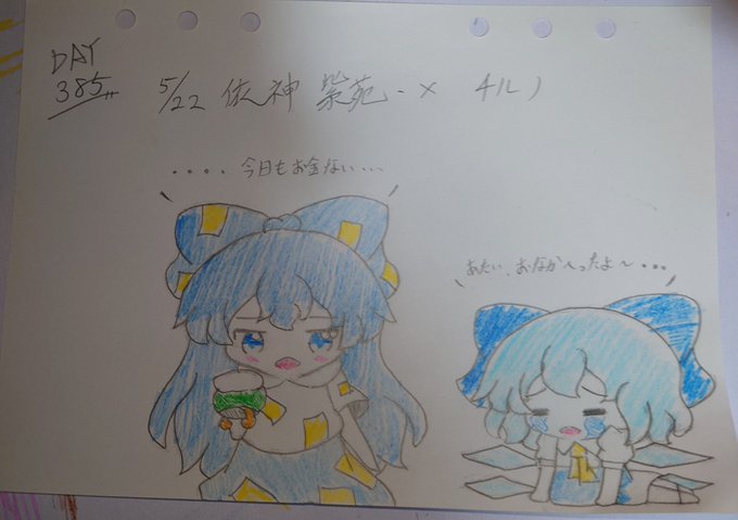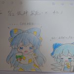 アナログイラスト385日目は紫苑×チルノ! 昨日、女苑だったので、紫苑描きました♪ 紫苑の能力を受けても、チルノちゃんならへこたれないと思いますが、某緑髪妖精が超速で瞬間移動してきそうな気がします^^; 今日から出張のため、何日かイラストお休みするかも… #東方Project #チルノ #依神紫苑