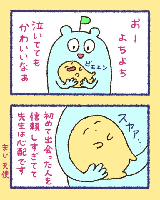 【#保育園ナースになりました EP.4】 初めて出会った人の腕の中ですぐに寝ちゃった👼 疑う心が無さすぎて、悪い人に誘拐されないか先生は心配になるよ #10分漫画チャレンジ #コミックエッセイ #2コマ漫画 #漫画が読めるハッシュタグ #保育園看護師