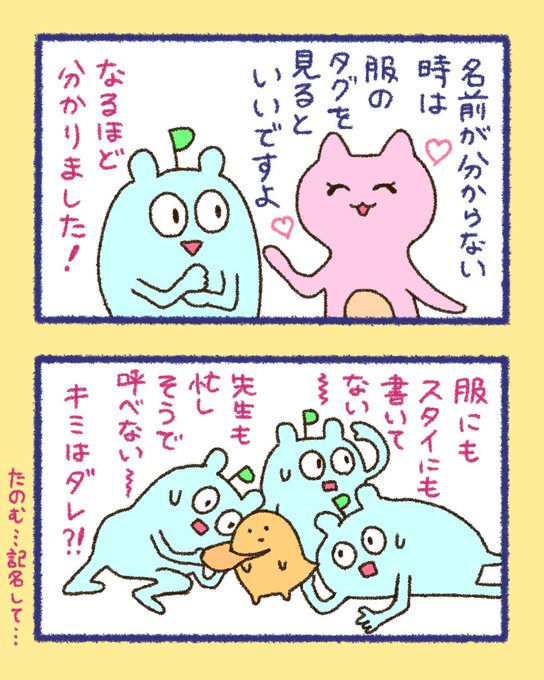 【#保育園ナースになりました EP.9】 こどもの名前がわからない時は服のタグの記名を見ればいい! と聞いたものの、無い時はどうすれば😇 私みたいな新人のためにも、お父さんお母さん記名をお願いします…🙇♀️ #漫画が読めるハッシュタグ #OCイラ #保育園看護師 #保育士 #絵日記