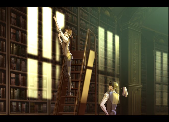 #俺のリヴァハン見てくれ ふわっと便乗させて頂きました。ありがとうございます。 図書館シリーズ。はじまりからもうひとつの未来まで。です。多分後ろから見る二人が好きなんだと思う。ちょっと遠くから見てるのが好きです。