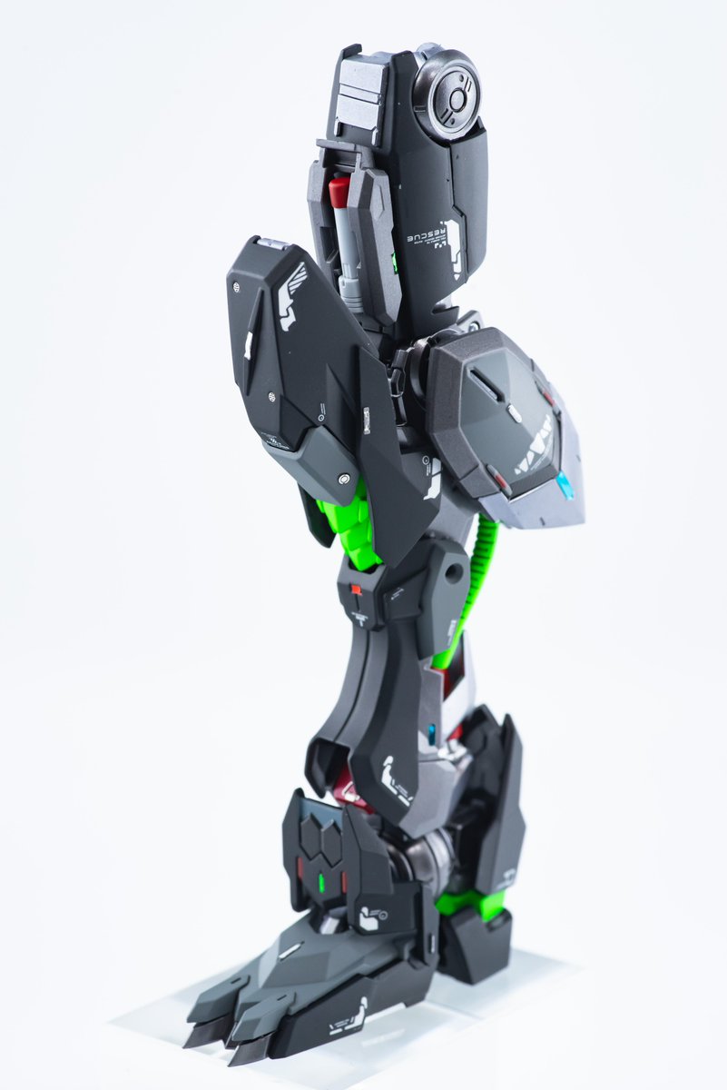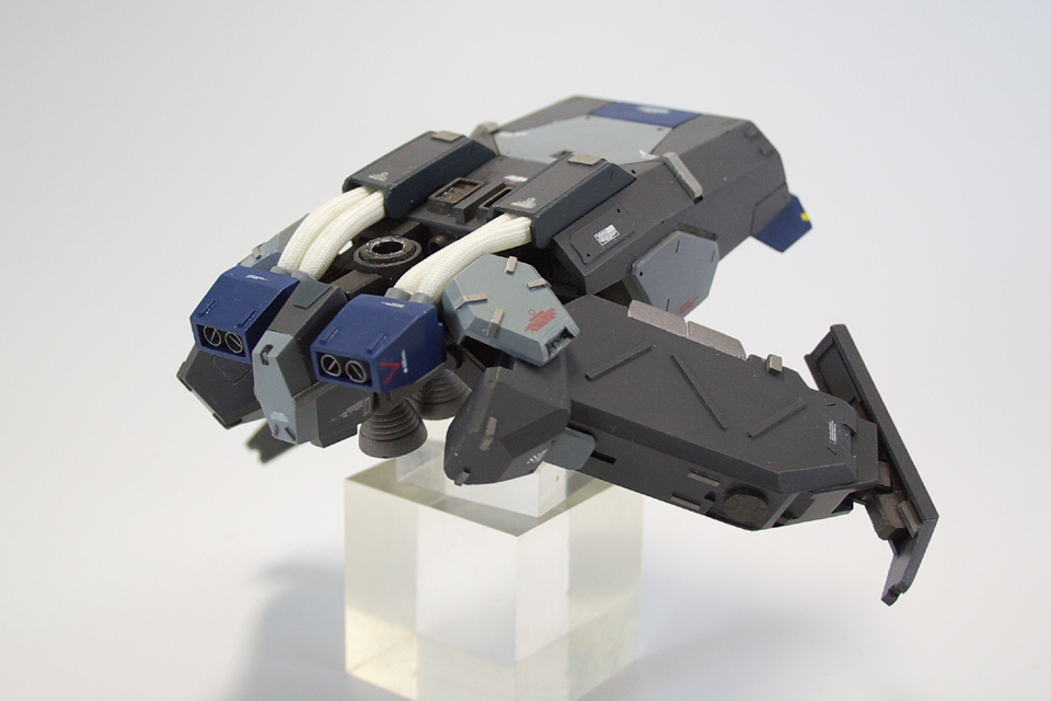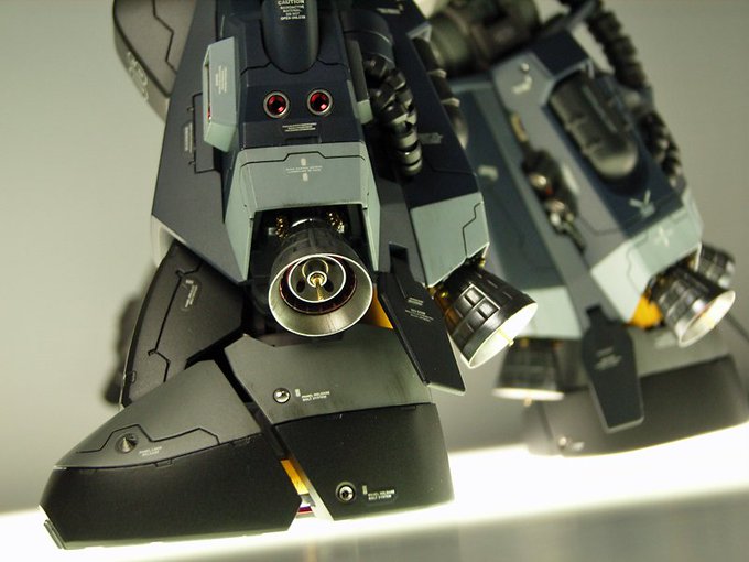 #俺の自慢の脚を見てほしいんだニャーゴ ウェイブライダー形態なので脚というよりメインバーニアですが、ムクをくり抜いてフィン加工して電飾ねじ込みました。 オリジナルデカールも頑張ったので見てくださいませ。 #ガンプラ #電飾作品
