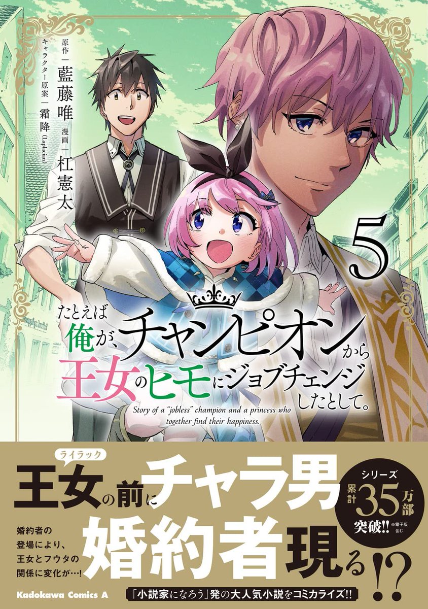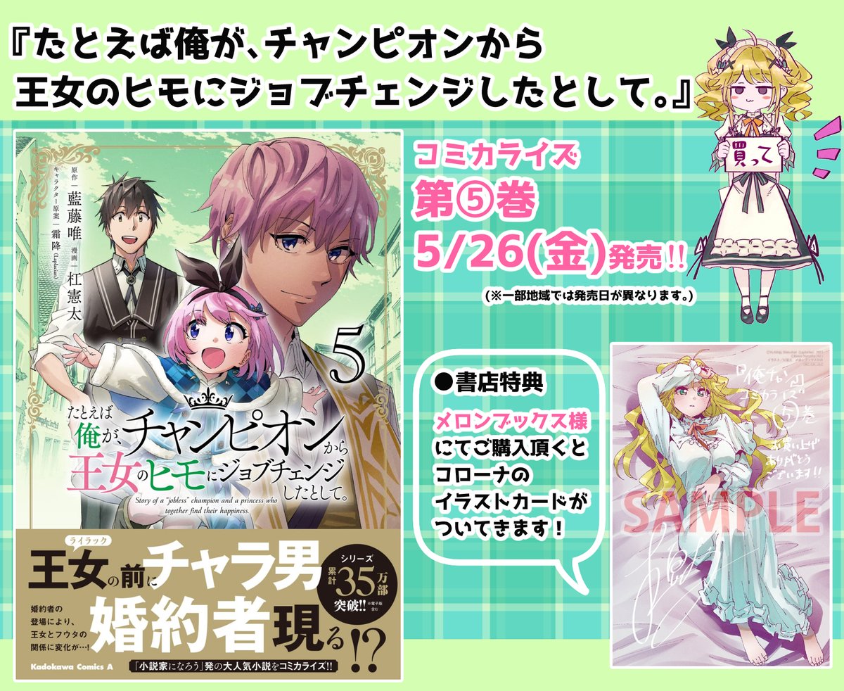 書影出てる! 『たとえば俺が、チャンピオンから王女のヒモにジョブチェンジしたとして。』 コミカライズ⑤巻は5/26発売予定です。 お陰様でシリーズ累計35万部突破~ありがとうございます⚔✨ #俺チャン amzn.to/42oAYyH