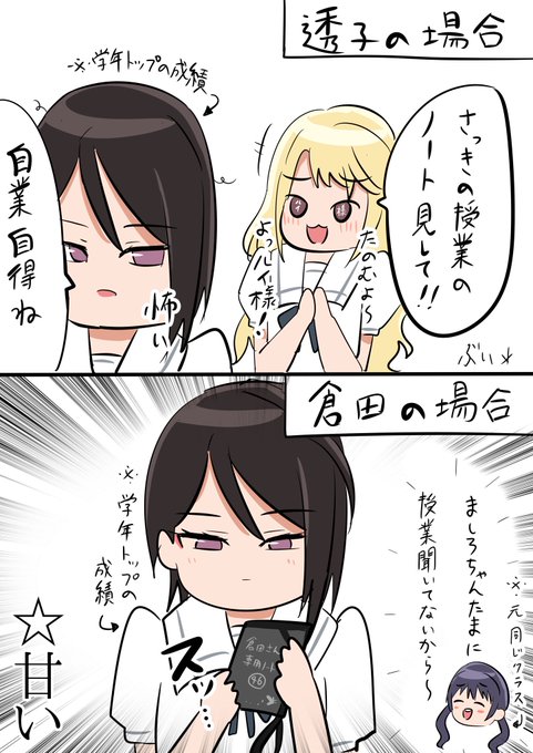 「見て瑠唯さん!瑠唯さんの強化合宿のおかげでいい点とれたよ!ありがとう!瑠唯さん!」な倉田ましろちゃん描きました! #倉田に甘い瑠唯さん #bandoriart 元ネタはぶい*さん(@GirLover_Buxl )の素敵なイラストです☺️ 描いていいと快く許可してくださりありがとうございました🙇 twitter.com/girlover_buxl/…