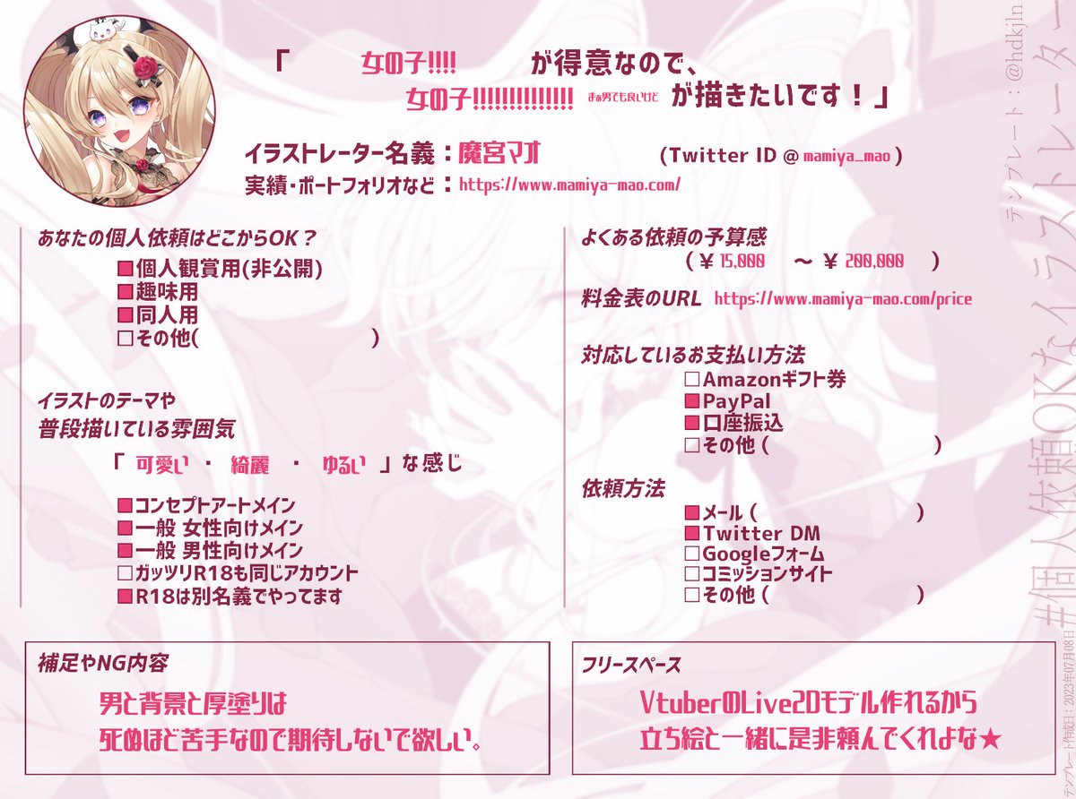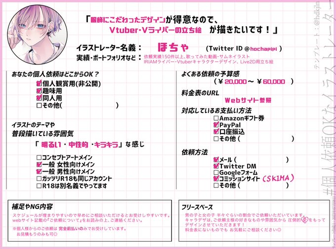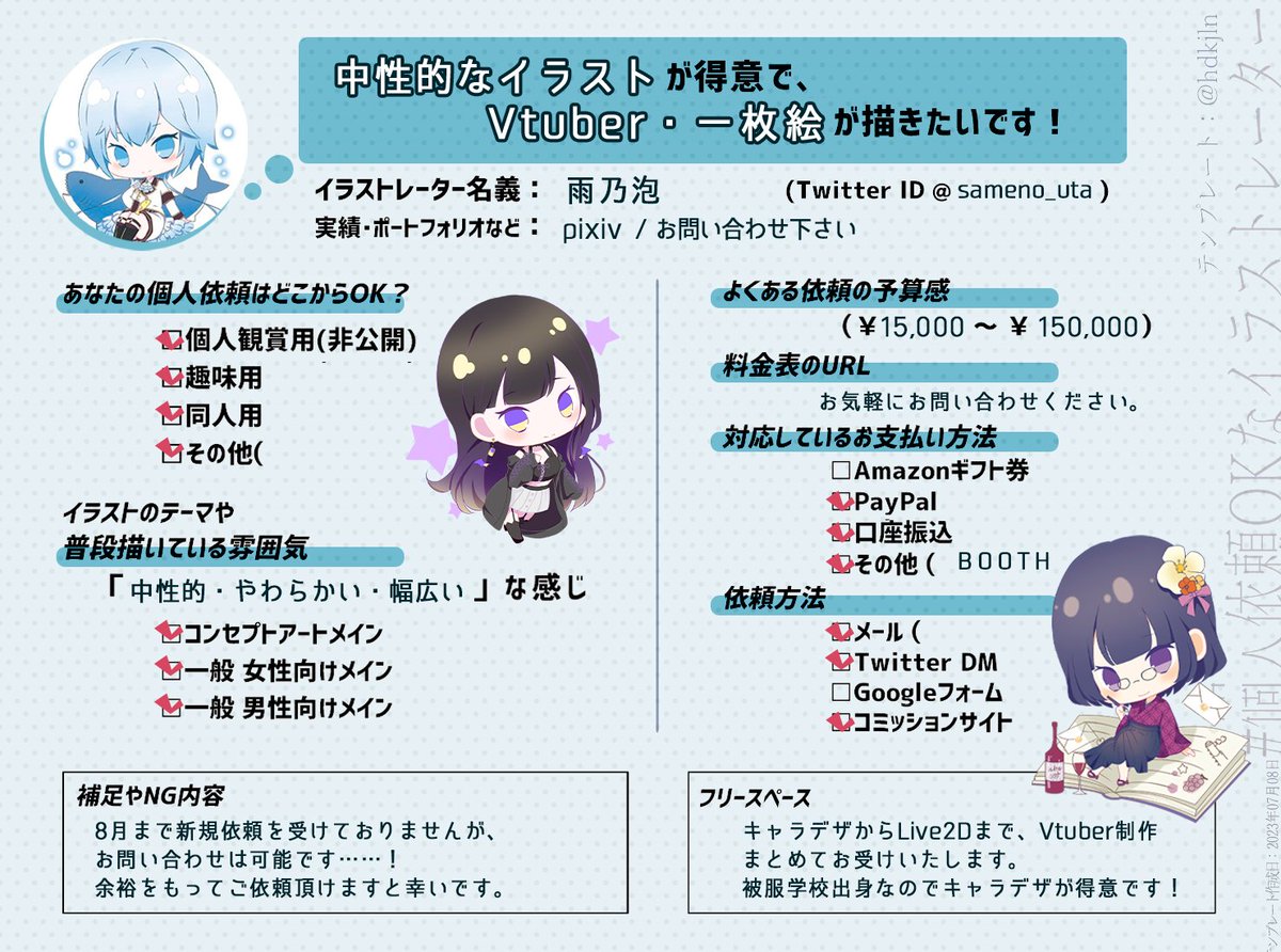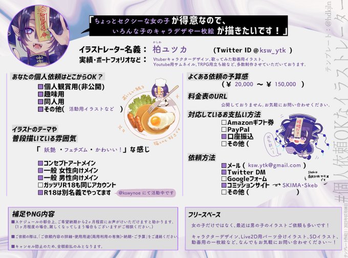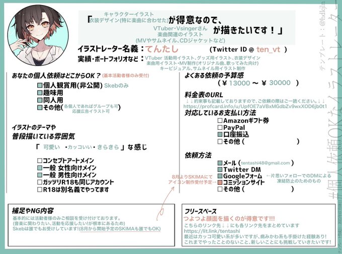 7月14日更新!テンプレートを修正いたしました。 【テンプレート&ご利用について】 #個人依頼OKなイラストレーター ①タグは「テンプレ使用必須」 ②現状AIは禁止 ※間違った使い方をしている方がいたらこのツイートを見せよう。ご協力をお願いします。 皆がWin-Winになれますように! twitter.com/hdkjln/status/…