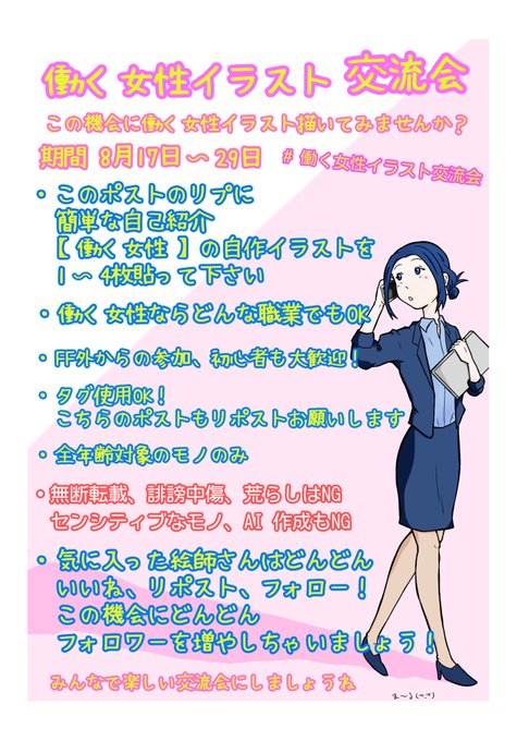 #働く女性イラスト交流会 フォロワー777人記念 【働く女性イラスト交流会】開催したいと思います🎉 OL、ナース、CA、コンビニ店員、主婦etc 一次、二次創作どちらでも 女性が働く姿をイラストで募集‼️ たくさんの参加お待ちしてます🙇