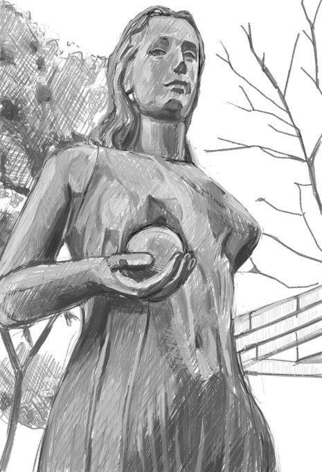 写真の模写(011 とある公園の像) おそらく手に持っているのは林檎、リンゴって不思議な果実ですね。最も親しみのある果実という気がします。 #写真模写 #像 #クリップスタジオ #絵師さんと繋がりたい #イラスト好きさんと繋がりたい #みんなで楽しむTwitter展覧会