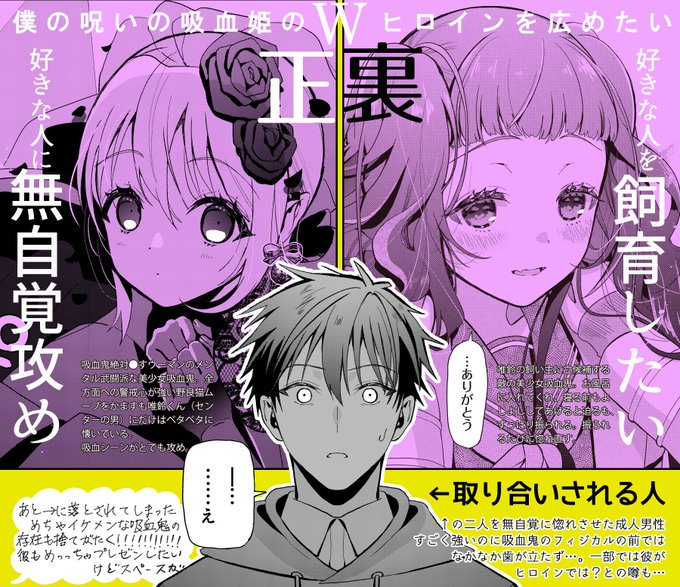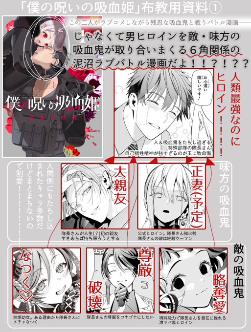ツイートを見た別の友人が 正ヒロイン、裏ヒロイン、ヒロイン♂の 3人のヒロインの三角関係をプレゼン作ってくれました! (掲載許可いただきました) 【試し読み】 twitter.com/chisakitamago/… #僕の呪いの吸血姫