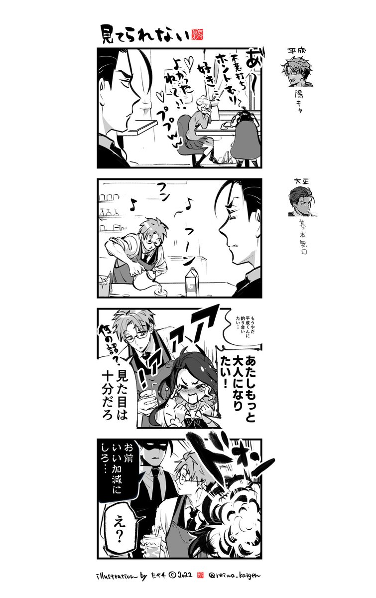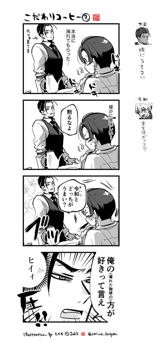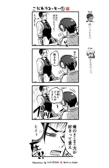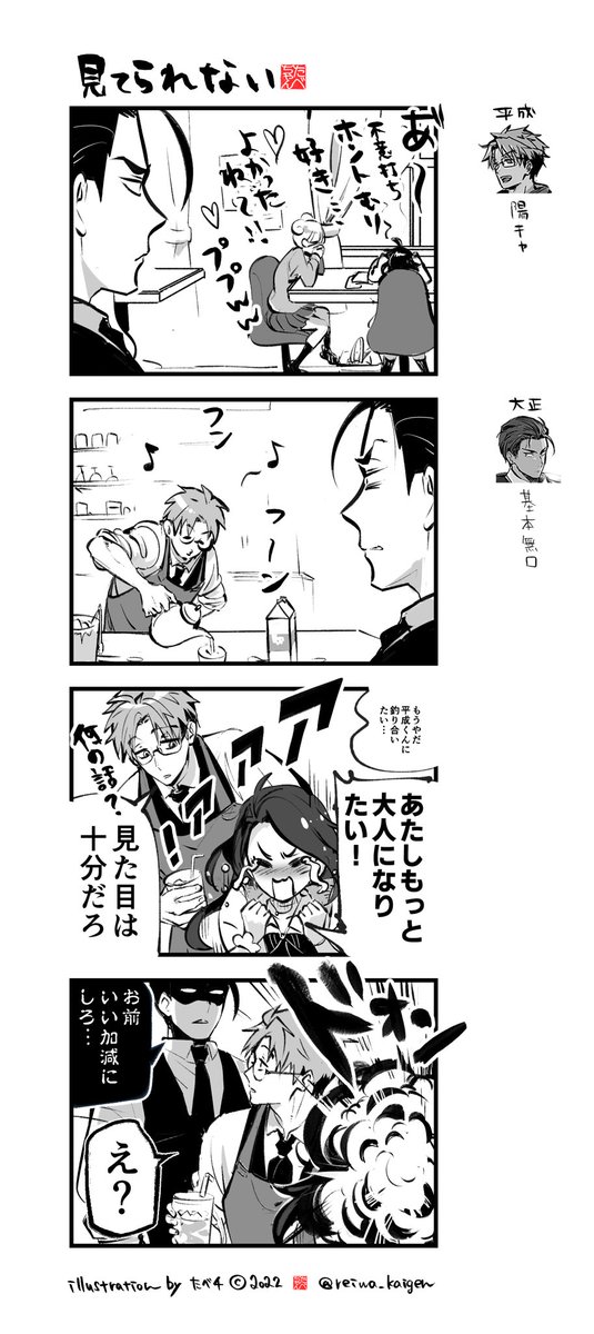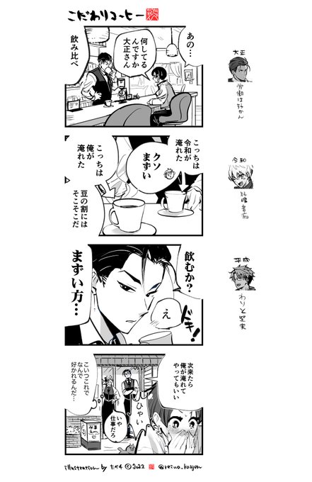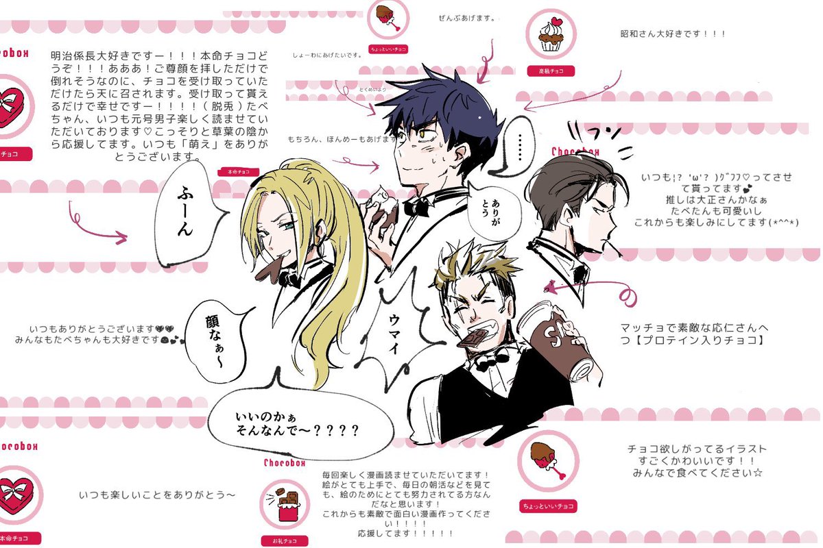 #今月描いた絵を晒そう 漫画編② ・大正のコミッション夢漫画 ・昭和と猫の日 #元号男子カフェ ・明治くんのファンボックス更新分(一部) #妄想腐女子たべこ美 ・おまけのチョコボックスイラスト。 #創作漫画 #4コマ漫画