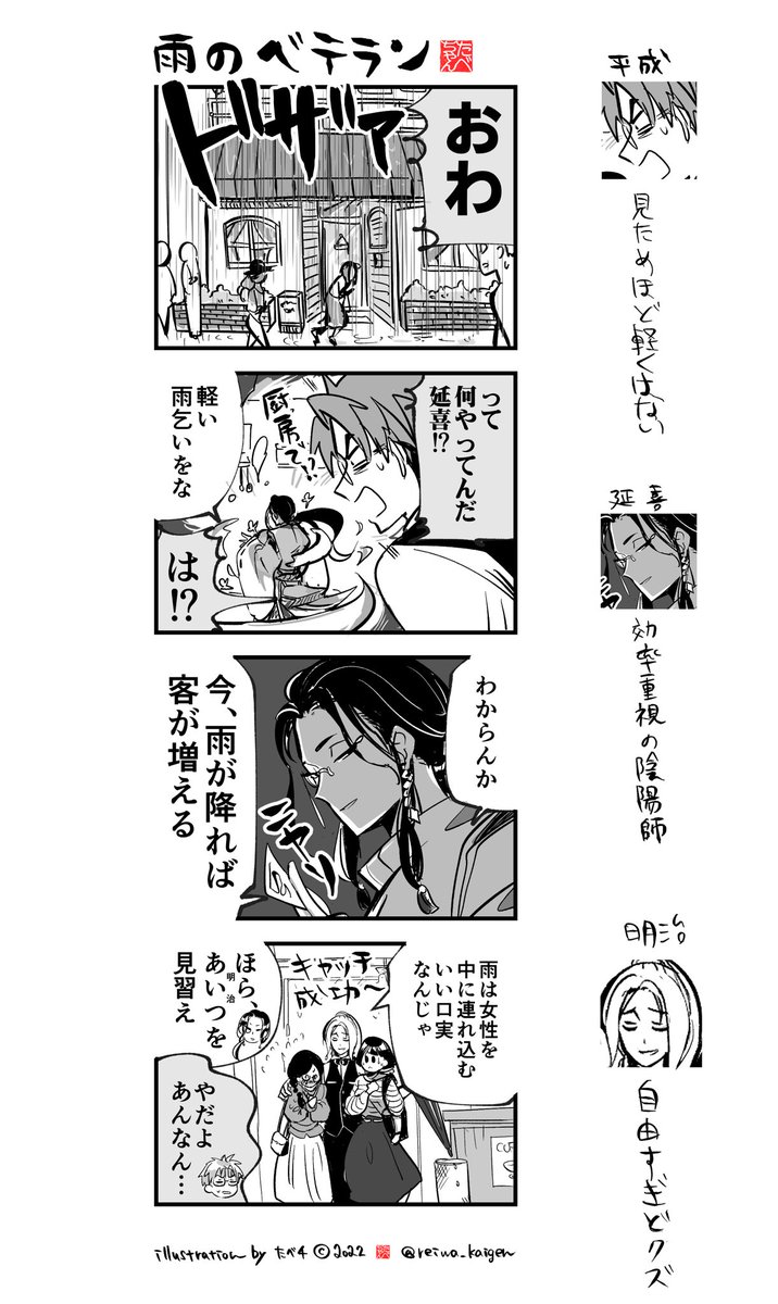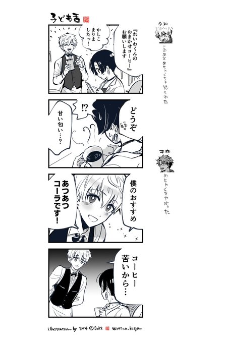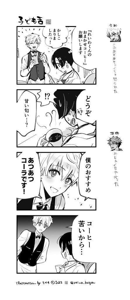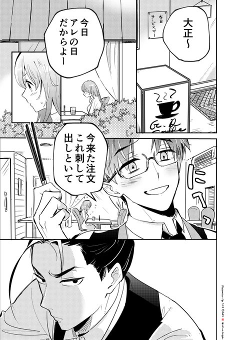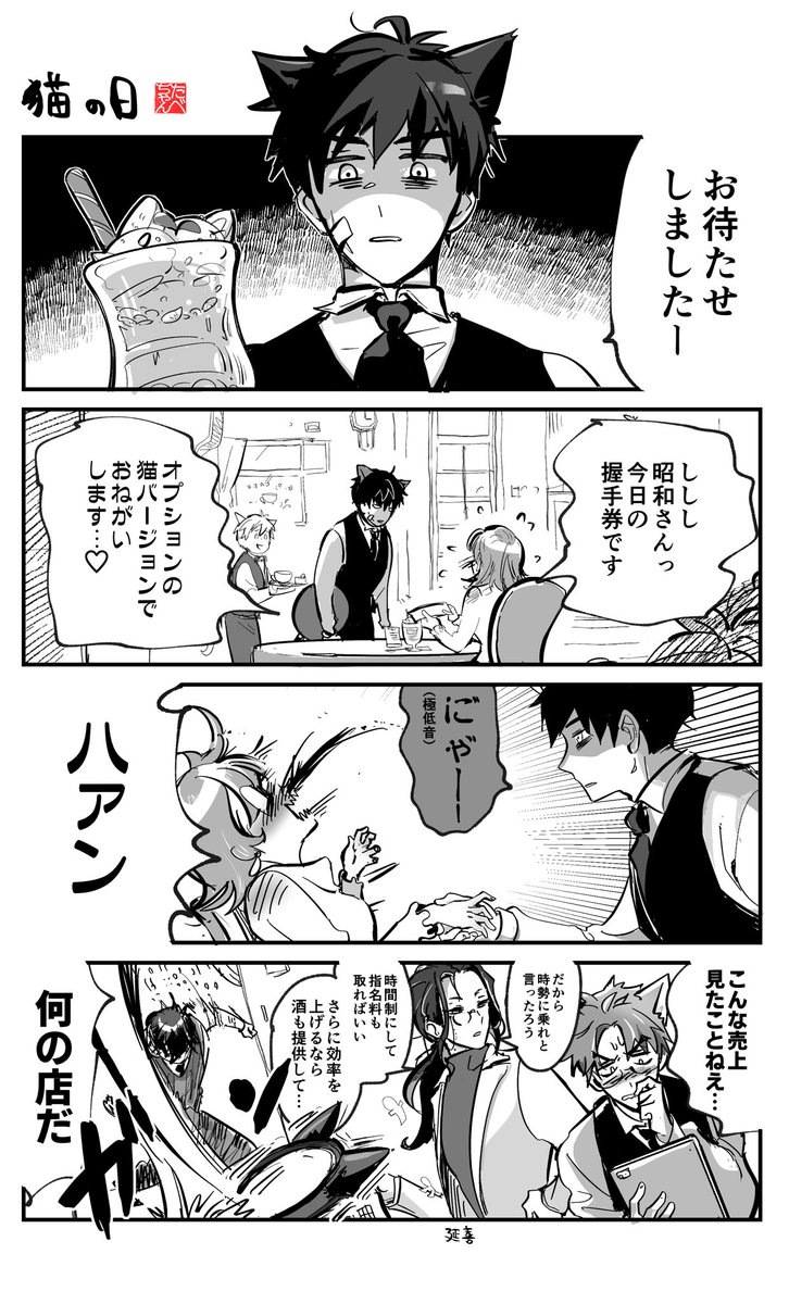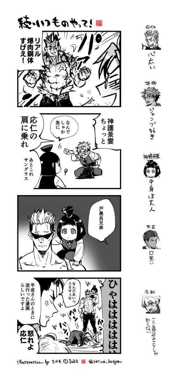 #今月描いた絵を晒そう 漫画編② ・大正のコミッション夢漫画 ・昭和と猫の日 #元号男子カフェ ・明治くんのファンボックス更新分(一部) #妄想腐女子たべこ美 ・おまけのチョコボックスイラスト。 #創作漫画 #4コマ漫画