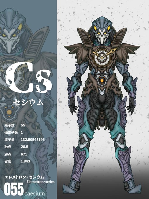 #元素で怪人描いてみた エレメトロン・セシウム セシウムといえば原子時計なので、そこからの連想で鳩時計がモチーフとなります 本来は機械的な時計の予定でしたが、某暴太郎戦隊の怪人が怪人だったので変更となりました() なお素体はボーリウム系統となります。 #オリジナル怪人
