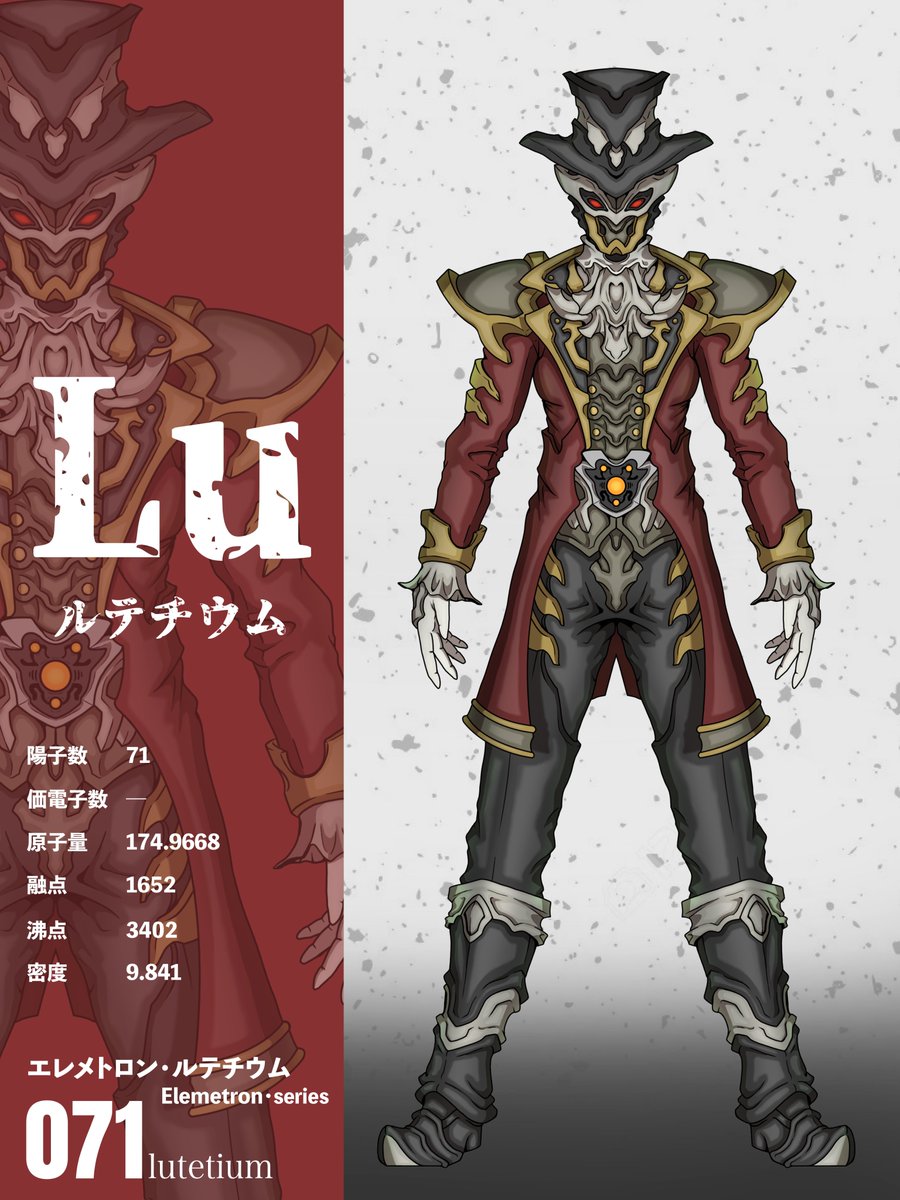 #元素で怪人描いてみた エレメトロン・ルテチウム 新年初描き... です() 別の一体の没案から帽子だけを残して、貴族で真摯な感じになればなと思いデザインしました。 おそらく全エレメトロンのなかで最も造形量が少ないですw #オリジナル怪人