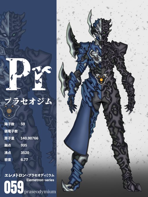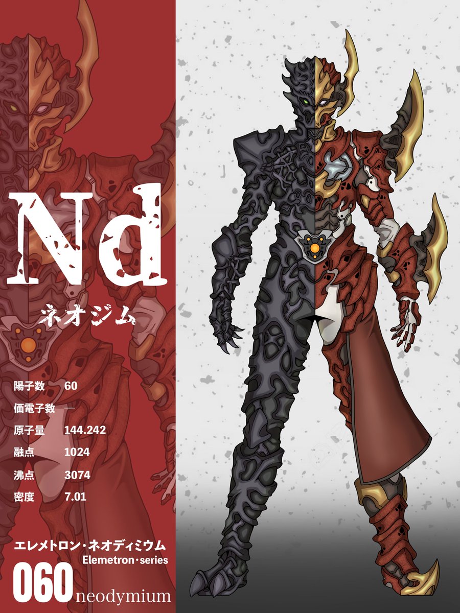 #元素で怪人描いてみた エレメトロン・プラセオディミウム エレメトロン・ネオディミウム 元々ジジミウムと呼ばれていた物質から分離された二つの元素、どちらも用途に磁石があることから、S極とN極を青赤の怪人で表し、左右非対称の怪人を反転し二体作るという荒技でデザインしました #オリジナル怪人
