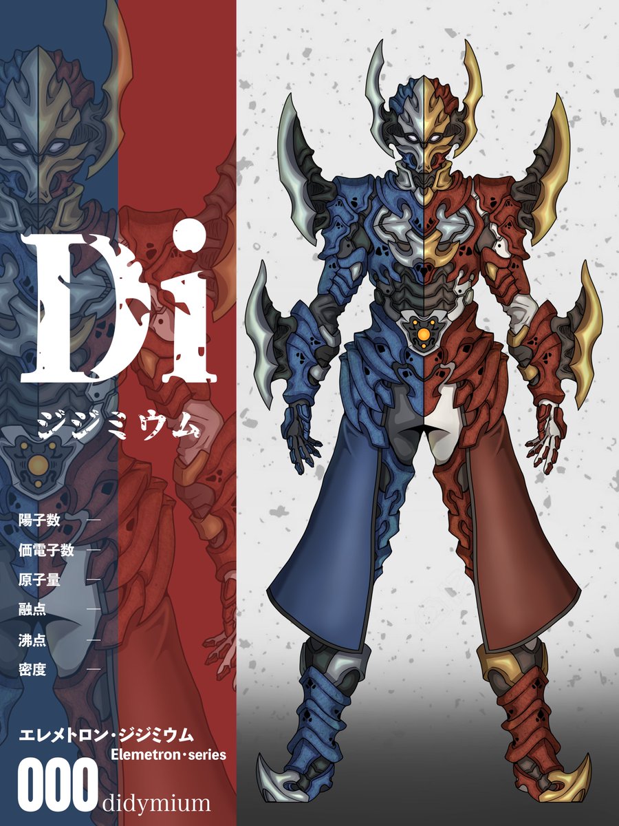 #元素で怪人描いてみた ? エレメトロン・ジジミウム 本来は元素ではないため、エレメトロンとしてカウントをするものではないものですが、その歴史から生まれた特殊な一体です デザインは、先日の二体の半身が融合したものなので、特に説明は言うことがないですねw #オリジナル怪人