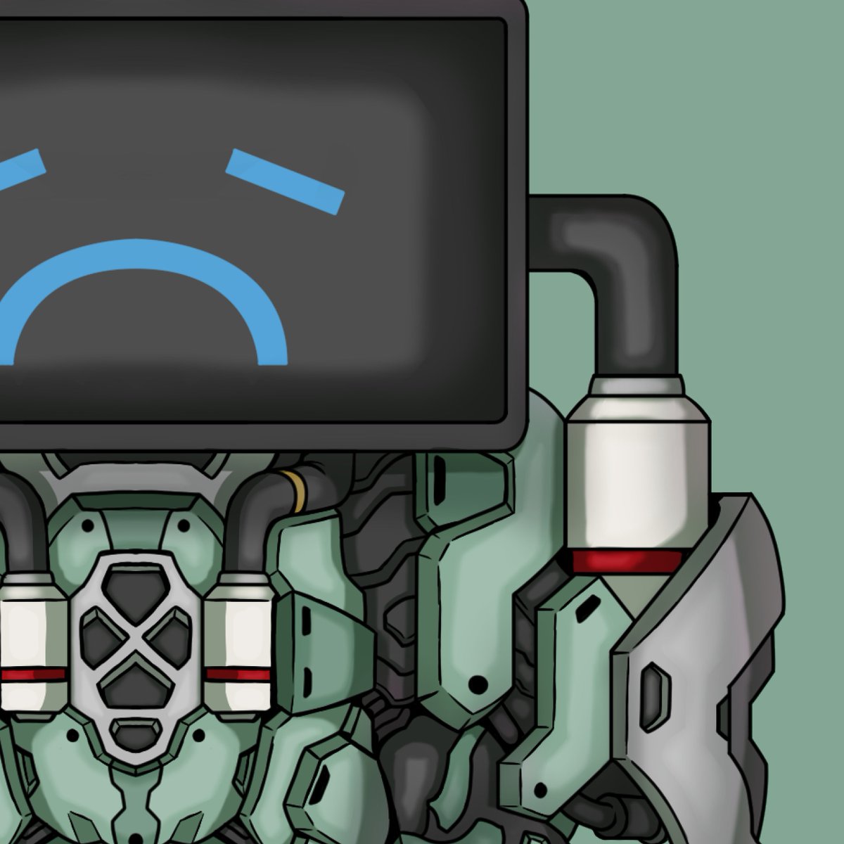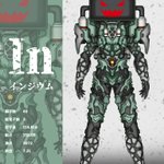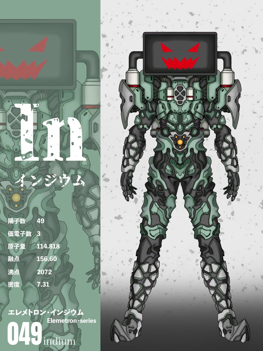 #元素で怪人描いてみた エレメトロン・インジウム 完全にこの液晶フェイスがやりたかったが故のデザインとなります。 上半身を機械的にしてゴツく盛ることで顔とのサイズ比のバランスをとりつつ、サマリウム素体の印象の差別化を図っています。 2,3枚目は表情差分(?)です #オリジナル怪人