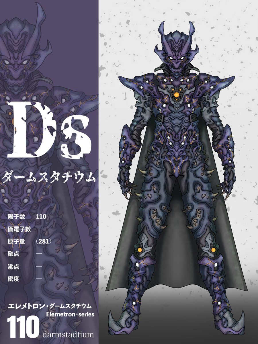 #元素で怪人描いてみた エレメトロン・ダームスタチウム 名の由来となった都市がドイツにあるということで、メフィストフェレスから悪魔をモチーフにかっこいい怪人をストレートに描きました。 黄金騎士の鎧的なところを意識していたら、単純に好きな怪人ができちゃいましたねw #オリジナル怪人