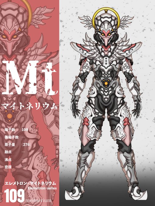 #元素で怪人描いてみた エレメトロン・マイトネリウム 前回が悪魔だったので、今回は天使です 名の由来となった人物の人生や、命名権争いがおこらなったことで平和の象徴とされているのでぴったりですねw なお、胴以外の部分は過去の怪人からの流用ですね() #オリジナル怪人
