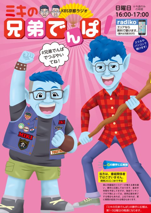 KBS京都、ミキの #兄弟でんぱ を勝手に広報しております😀。放送は本日(日曜)昼13時から。先週は投稿を二つ採用いただき、ありがとうございました😄。また新しく、何通か送りました😚。 #絵描きさんと繋がりたい