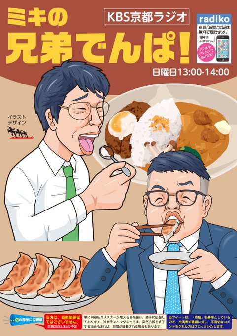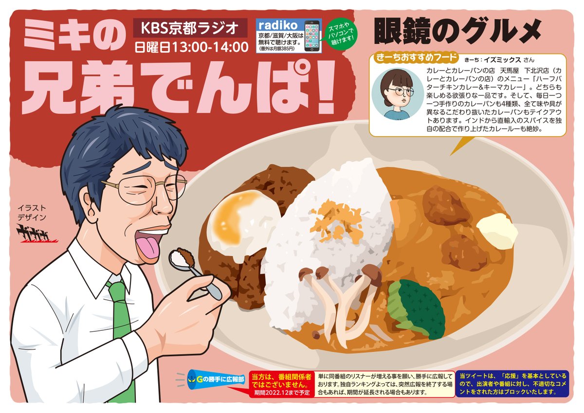 KBS京都、ミキの #兄弟でんぱ を勝手に広報しております😀。放送は本日(日曜)昼13時から。今回の「きーちおすすめフード」は、イズミックスさんから、ハーフバターチキンカレー&キーマカレーのご紹介です。美味しそうですね😋! #絵描きさんと繋がりたい