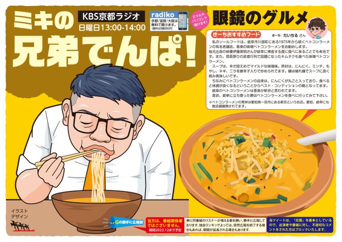 KBS京都、ミキの #兄弟でんぱ を勝手に広報しております😀。放送は本日(日曜)昼13時から。今回の「きーちおすすめフード」は、だいちるさんから、ベトコンラーメンのご紹介です。ニンニクたっぷりだそうですよ😘! #絵描きさんと繋がりたい