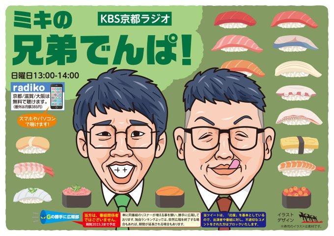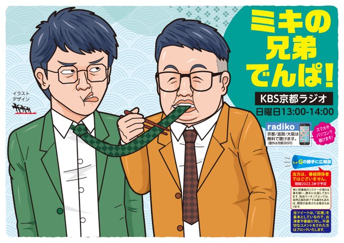 「リスナーと番組をつなぐ広報」今回は、投稿者でもおなじみ、長靴はショートカットさんに文章をお願いしました😀。ご協力感謝です!愛情いっぱいの文章…リツイートなどくださると助かります🙏。 KBS京都、ミキの #兄弟でんぱ を勝手に広報中😀。本日(日曜)お昼13時。 #絵描きさんと繋がりたい