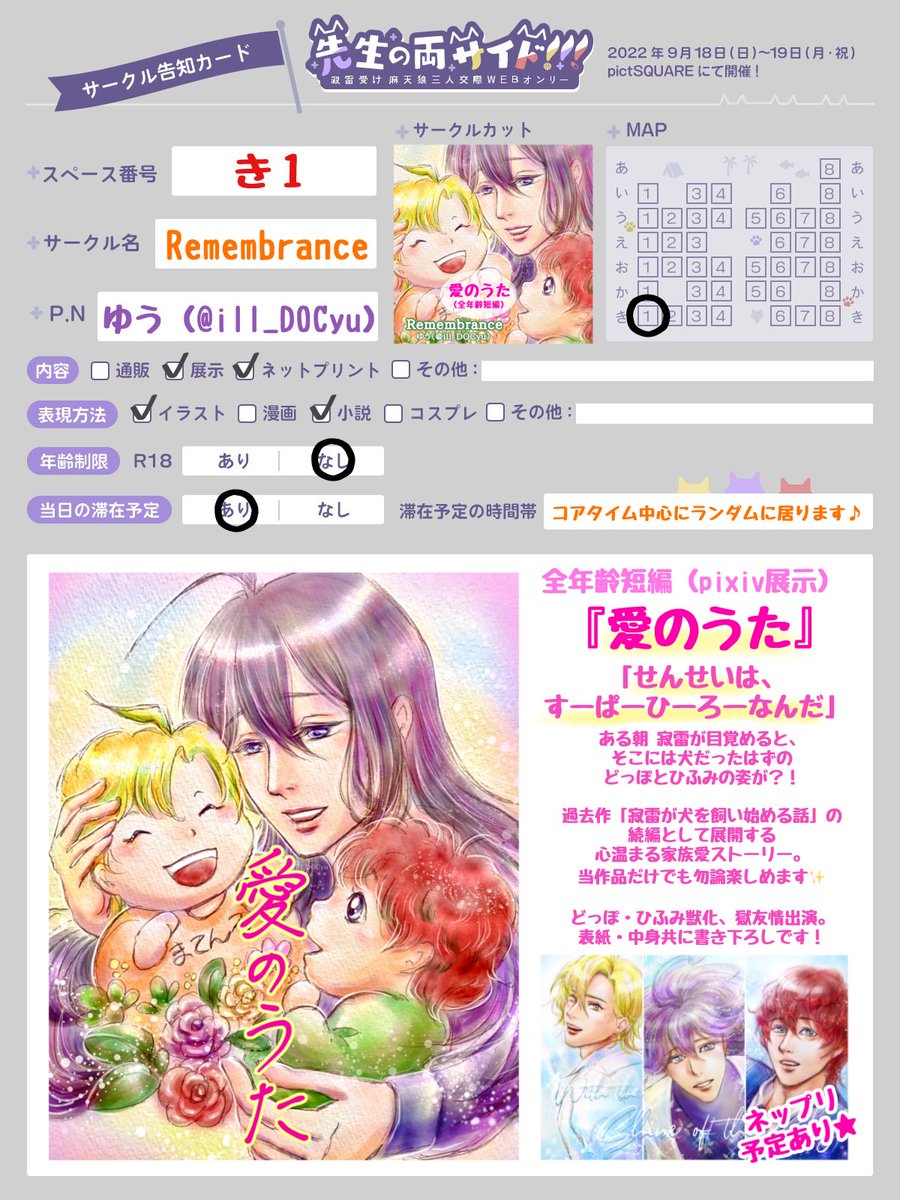 #先生の両サイド #先生の両サイド告知 2022.9.18〜19 まてんろ三人交際Webオンリーに参加させていただきます! 素敵な企画をありがとうございます✨ 初の表紙&中身共に書き下ろしの 新作短編展示します!🌈 会場入って一番左下、噴水の綺麗なお庭が目印です⛲️ お気軽に遊びにいらしてください🎵