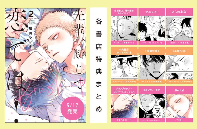 【各書店特典まとめ】 ✨5/17(水)発売✨ 『先輩、断じて恋では!Brush up 2』 各書店特典まとめです🌻 漫画沢山描かせて頂きました! 何卒よろしくお願いします🌷 【特典まとめ】➡️comic.mf-fleur.jp/product/senpai… #先輩断じて恋では #せぱ恋 twitter.com/hare_shinta/st…