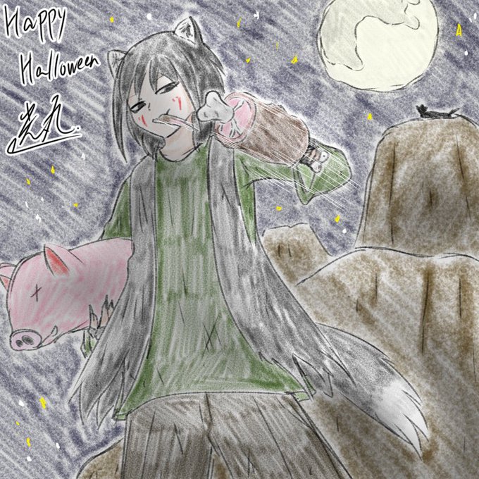 #イラスト #絵描きさんと繋がりたい #秋の創作クラスタフォロー祭り #ハロウィン #私と黒の用心棒 #光丸のハロウィン仮装大会 二人目 クロ × 狼男 「ハロウィンとはお菓子が頂けるお祭りと聞いていたのですが…なぜか皆さん…お菓子ではなくお肉を渡してくるのです…なぜなのでしょうか…?」