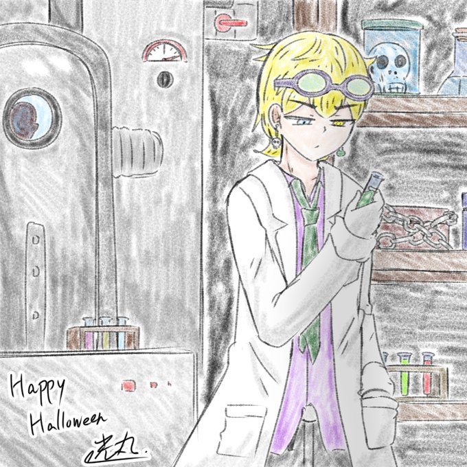 #イラスト #絵描きさんと繋がりたい #秋の創作クラスタフォロー祭り #ハロウィン #私と黒の用心棒 #光丸のハロウィン仮装大会 三人目 アレックス=ミラー × マッドサイエンティスト 「科学者になって能力者になれる薬を作ってみたいと思った頃があったな… なに?厨二病?…私は違うぞ?違うからな!」
