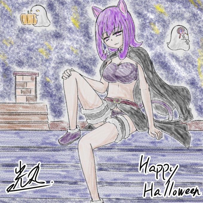 #イラスト #絵描きさんと繋がりたい #秋の創作クラスタフォロー祭り #ハロウィン #私と黒の用心棒 #光丸のハロウィン仮装大会 四人目 村山 睦美 × 猫娘 「あら?お菓子が欲しいの?ん~…ただあげるだけじゃつまらないしおいかけっこでお姉さんを捕まえられたらあげてもいいわ♪どう?やるかにゃ?」