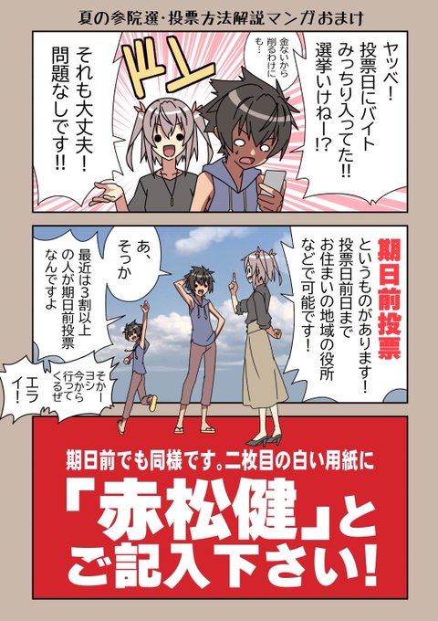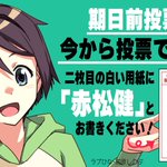 【拡張希望】期日前投票に行きましょう! 全国比例は、日本全国の誰でも「赤松健」に投票できます。2枚目の投票用紙には、必ず個人名で「赤松健」と書いて投票お願いします! マンガアニメゲームが大好きな18~19才の皆さまも是非! #漫画家を国会へ #全国比例は赤松健 kenakamatsu.jp/page-21214/