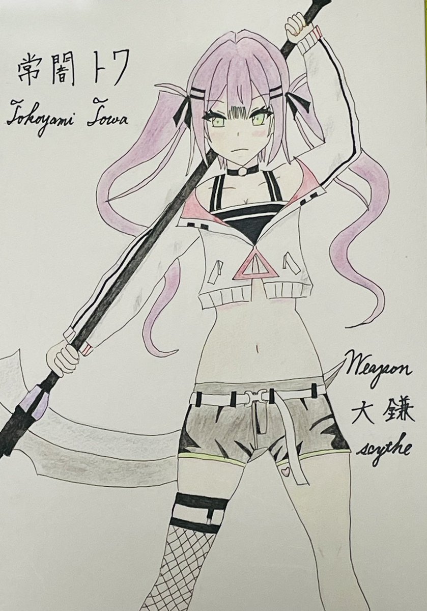 10月2日のお絵描きは常闇トワ様 武器:大鎌 悪魔的な雰囲気を漂わせるトワ様に持たせた武器は大鎌。 この絵と同じポーズを自分でとってみましたが、かなりキツイですw #TOWART #全JPホロメンに武器を装備させる