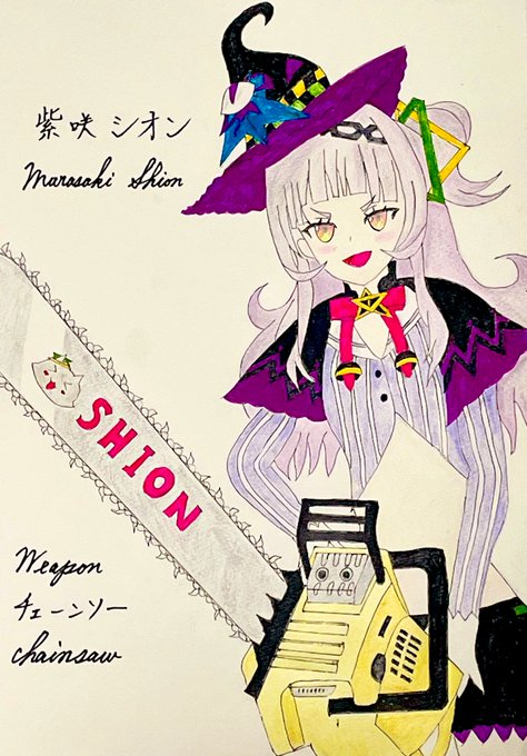 全JPホロメンに武器を装備させる 紫咲シオン 武器:チェーンソー ホロメン1ハロウィンっぽい衣装のシオンちゃんをハロウィン当日に描きたかったが間に合わなかった。 ハロウィンといえば当然チェーンソーだよね?(どういう思考だ?) #シオンの書物 #全JPホロメンに武器を装備させる