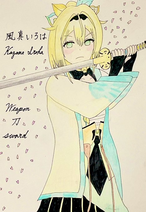 全JPホロメンに武器を装備させる 風真いろは 武器:刀 本当は手裏剣を装備させたかったのですが、怒られるのが怖くて無難に刀にしました。 背景に桜を散らしてみました🥰 #いろはにも絵を #全JPホロメンに武器を装備させる