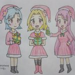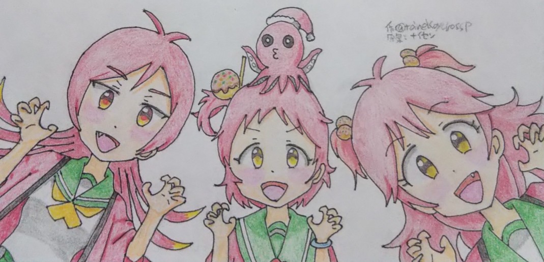 クリスマスに遊びに来た #大阪3人娘 描きましたー!(*≧∇≦)ノ🐙🐈️ 玄関開けたら3人で「がおー!」 #クリスマスイラスト #八尾たん #あべのたん #なんばたん #ビッカメ娘 ( #ナイセン ) #ビッカメ娘を描き隊 #ファンアート #色鉛筆 #絵描きさんと繋がりたい