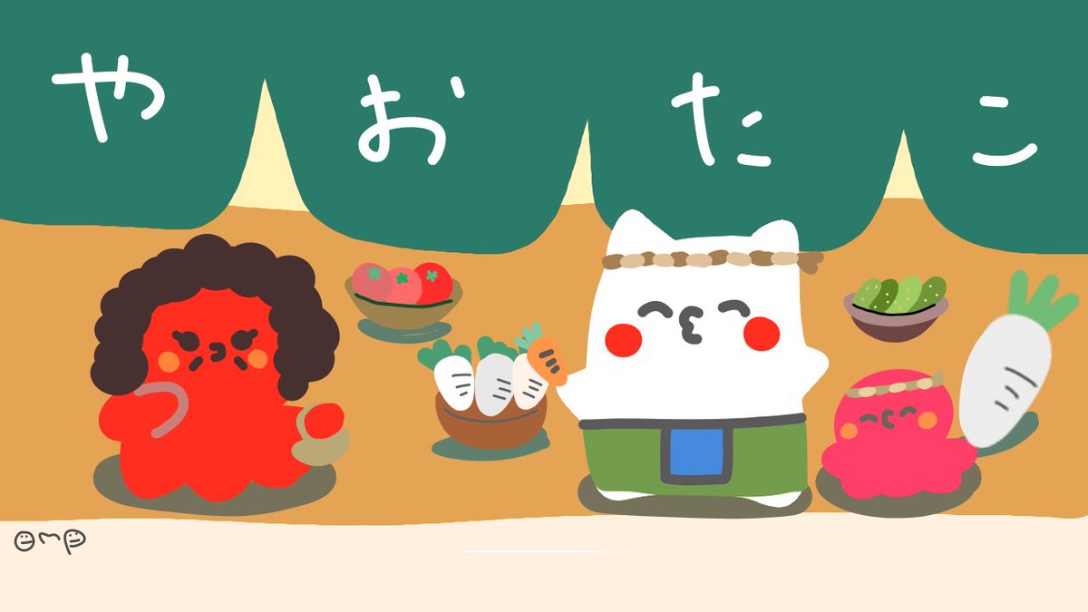 おはようございます** 早めに…! やおたこ営業中~! 東京とかなら夜中までやってる 歯医者をテレビで見たのですが、 八百屋とかも営業してるんかな? 未知なる世界です。 今日も良い日になりますように~🥕🍆🍅 #おは戦40524mk #ゆるキャラ #ゆるいイラスト #イラスト #ilustracion #八百屋