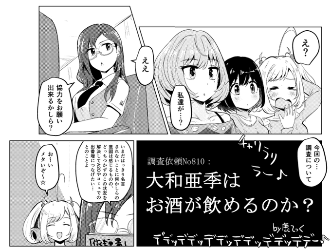 C101で頒布される【After20合同】にマンガ2P、裏表紙大和亜季で参加してます! 『大和亜季はお酒が飲めるのか飲めないのか?』 長年議論されるこの謎を解明すべく、番組調査班は八神マキノ氏に調査を依頼した! ※マキノんの出番はこの2コマだけです🙇 ※メタいです。 twitter.com/catglass46/sta…
