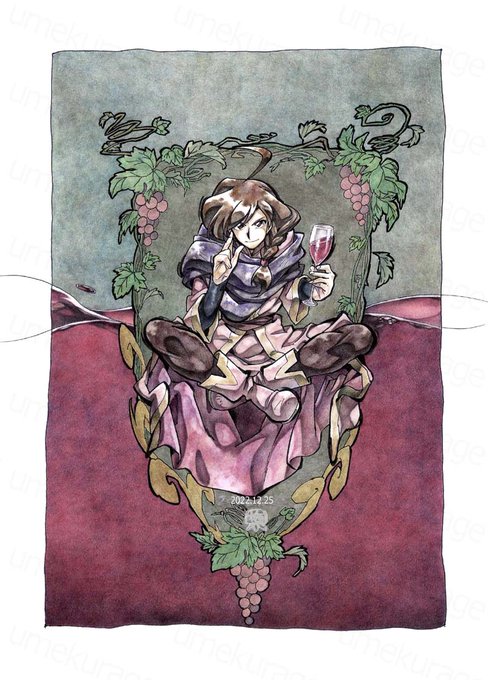 #共通テーマお絵描き ワイン🍷 「ワイン瓶の中のスカボロウ」 (透明水彩・ランプライト水彩紙) スカボロウはコントラットの世界に出てくる土地の名前で、契約聖女レトがいる場所。レトは葡萄を育てて収穫しワインも作っているので、アンソロ漫画①に出てくるスカボロウワインのラベルにしました🍷