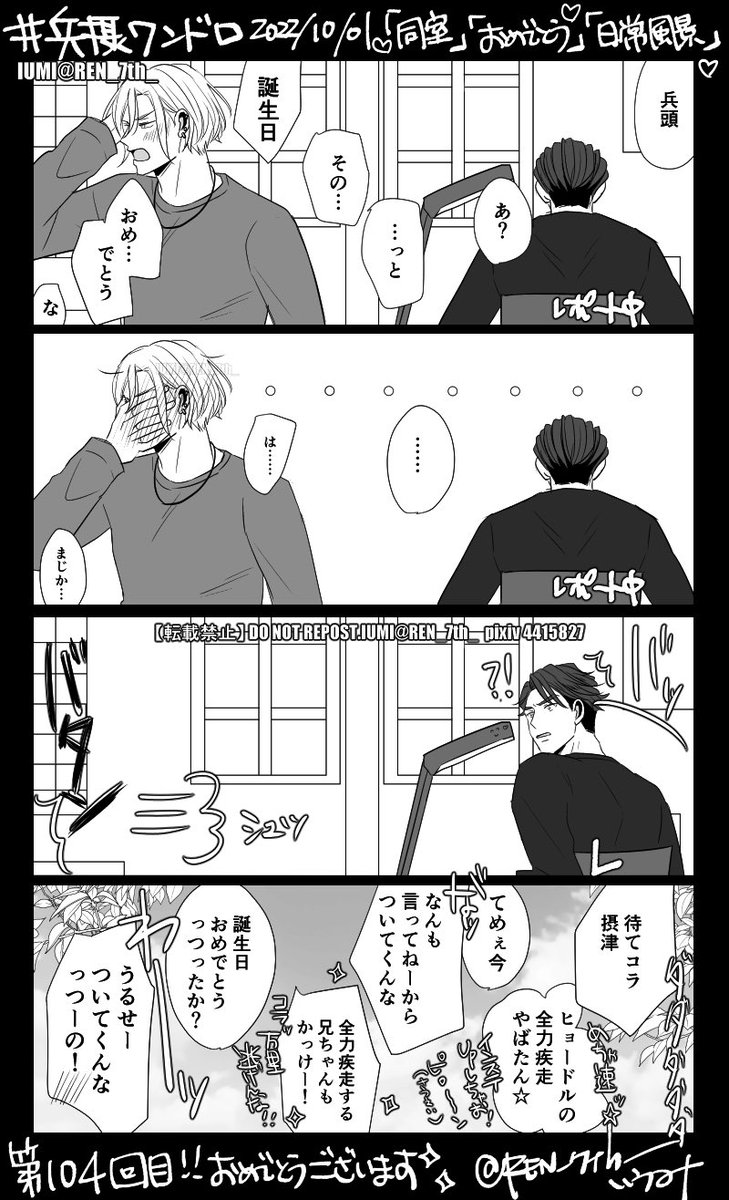 兵摂ワンドロ第104回目‼️ ❤️おめでとうございます🎉✨ お題「同室」「おめでとう」「日常風景」で 十座が万里を追いかける図最高だったな😄日常的にドタバタないちゃ追いかけっこしててほしい! #兵摂版深夜のワンドロ一本勝負 @hyose__60