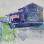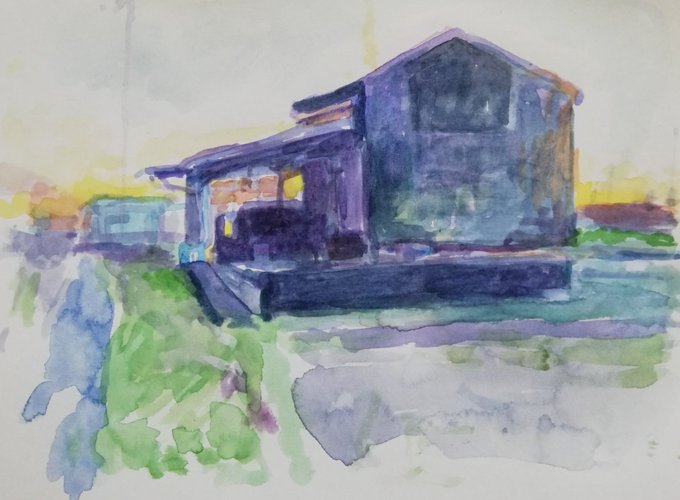 夕暮れの作業小屋 再生紙に水彩 16.2×22.5cm #水彩画 #水彩 #watercolorpainting #watercolor #drawing #ドローイング #artwork #landscape #作業小屋 #風景画 #再生紙 #contemporaryart