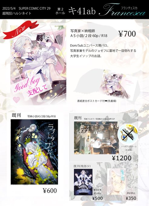 5月4日超残狂ハルシネイト2022 お品書き | toto@ #pixiv pixiv.net/artworks/97971… 2022/5/4 超残狂ハルシネイト 【東2 キ45a】ととのわ 新刊・既刊・すだまさんの委託イラスト集ございます! 無配も間に合えば…! #写納プチオンリー #写し残されしは黄色の薔薇